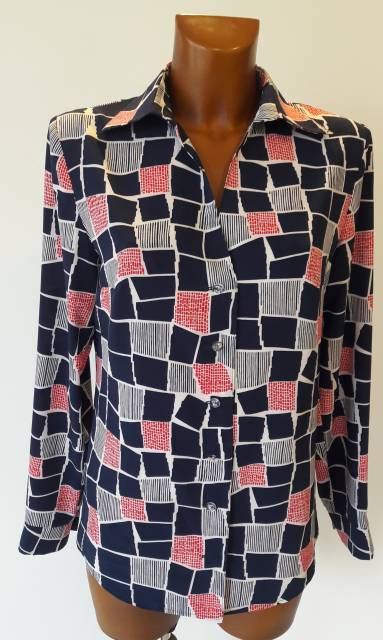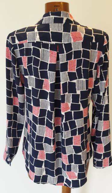 Denní košilová halenka, propínací s légou, košilový límec, dlouhý rukáv do manžety možný stáhnout na patku, na zadním díle sedloa protiklad.Použitý materiál: umělé hedvábí:polyester,elastan