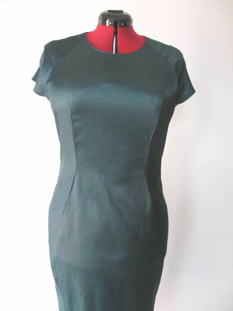 Společenský kostým. Šaty úzké, členěné, raglánové krátké rukávy, lodičkový výstřih, tvarované členící švy. Délka šatů 65cm. Použitý materiál: šatovka s jemným třpytem (viskóza,polyester,elastan).