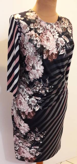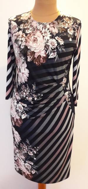 Denní úpletové šaty, efektní vzor modrého šikmého pruhy s květem, přední díl členěn se sklady, vypodšívkován, zadní díl hladký. 3/4 rukáv. Použitý materiál: polyester/elastan