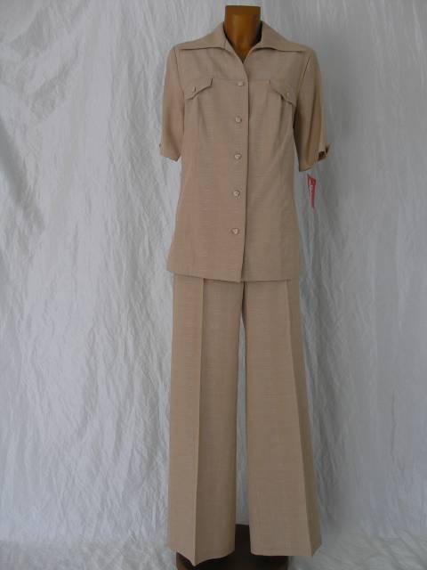 Letní kostým:kalhoty a kabátek. Kabátek, fazonka, sedla, ozdobné patky, rovný , na knoflíky, krátký rukáv s ozdobnou patkou. Kalhoty hladké, bez pásku rovné nohavice.Použitý materiál: (viskoza,polyester)
