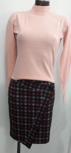 Denní sukně, pouzdrová hladká s efektním vzorem kostky, falešné zavinovací členění, s úpletovou podšívkou. Délka sukně 55cm, Použitý materiál: úplet (polyester/elastan)