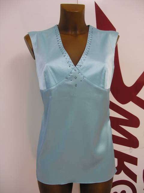 Společenský top tyrkys, přestřižen pod prsy, výstřih dozdoben kameny, efektní rozparky na rameni. Použitý materiál: satén(polyester,elastan). Délka topu 60cm.